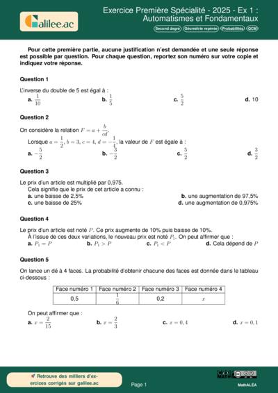Exercice Première Spécialité - 2025 - Ex 1 : Automatismes et Fondamentaux