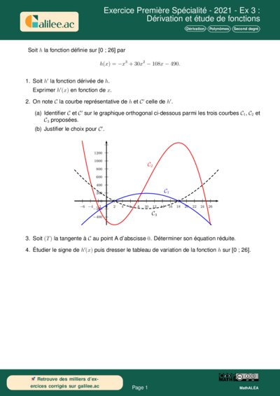 b) Justification : $h'$ est une fonction du second degré dont le coefficient dominant est $-3 < 0$. Sa représentation graphique est donc une parabole orientée vers le bas. De plus, $h'(0) = -108$, ce qui correspond à l'ordonnée à l'origine de $\mathcal{C}_1$.