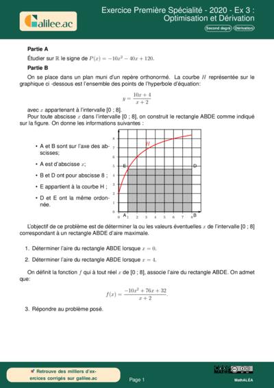 Cet exercice, issu des épreuves de 2020 pour la spécialité mathématiques en Première, combine deux piliers du programme : l'étude d'un trinôme du second degré et l'application de la dérivation à un problème de géométrie. L'objectif est de trouver l'abscisse $x$ qui maximise l'aire d'un rectangle dont un sommet est mobile sur une hyperbole. Ce type d'exercice est classique aux épreuves de baccalauréat car il vérifie la capacité de l'élève à modéliser un problème physique par une fonction et à utiliser les outils de l'analyse pour conclure.