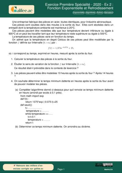 Cet exercice de Première Spécialité porte sur la modélisation d'un phénomène thermique par une fonction exponentielle du type $f(t) = Ce^{at} + k$. Il s'agit d'étudier le refroidissement de pièces industrielles en acier. Les élèves doivent mobiliser des compétences en calcul différentiel, en étude de fonctions et en algorithmique Python.