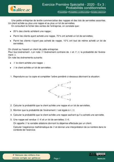 Cet exercice, issu des épreuves de Première Spécialité de 2020, est un modèle classique pour l'étude des probabilités conditionnelles et des variables aléatoires. Il place l'élève dans un contexte de gestion commerciale (une entreprise de textile) où deux événements dépendants l'un de l'autre sont étudiés : l'achat d'une nappe (N) et l'achat d'un lot de serviettes (S).
