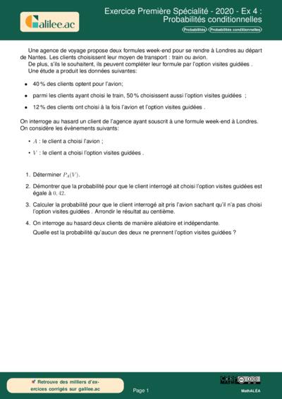 Exercice Première Spécialité - 2020 - Ex 4 : Probabilités conditionnelles