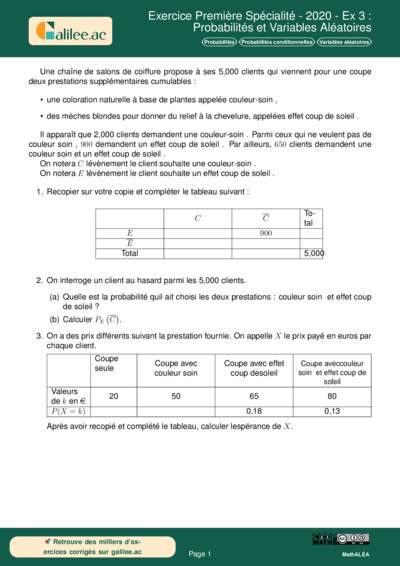 Cet exercice est un classique du programme de Première Spécialité, croisant la gestion de données brutes via un tableau de contingence et l'étude d'une variable aléatoire. Le contexte est celui d'une chaîne de coiffure où les clients peuvent choisir entre plusieurs prestations cumulables. La difficulté principale réside dans la lecture attentive du texte pour traduire les effectifs en intersections d'événements.