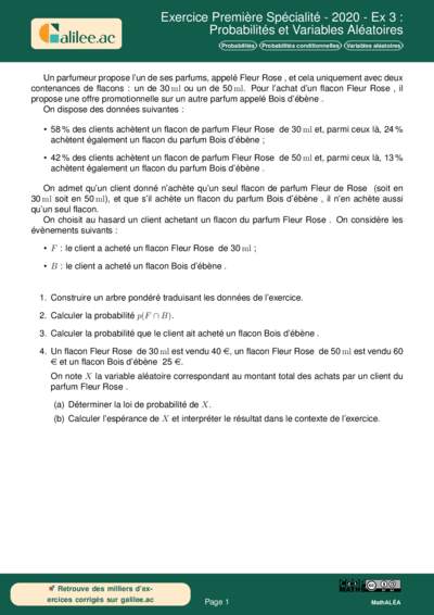 Tu veux maîtriser les probabilités conditionnelles et les variables aléatoires ? Cet exercice de Première Spécialité est le support idéal ! À travers un cas concret de vente de parfums, tu apprendras à :