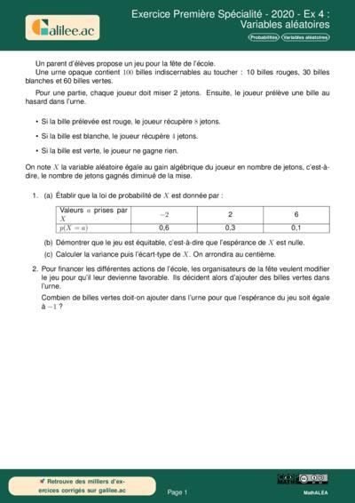 Exercice Première Spécialité - 2020 - Ex 4 : Variables aléatoires