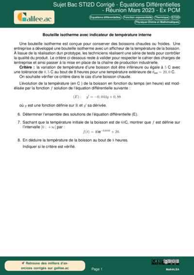 Cet exercice de la session de Mars 2023 pour l'académie de la Réunion est une application classique mais fondamentale du programme de Physique-Chimie et Mathématiques (PCM) en STI2D. Il mobilise l'étude des équations différentielles du premier ordre du type y' = ay + b, appliquées ici à la loi de refroidissement de Newton.