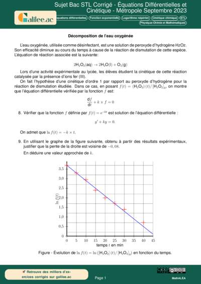 Cet exercice, issu de l'épreuve de Physique-Chimie et Mathématiques (PCM) du Bac STL 2023 (session de septembre, Métropole), est un classique de l'interdisciplinarité. Il illustre parfaitement comment les outils mathématiques, notamment les équations différentielles et les fonctions logarithmes, permettent de modéliser des phénomènes physiques comme la décomposition chimique. L'exercice se concentre sur la cinétique d'ordre 1 de la dismutation du peroxyde d'hydrogène ($H_2O_2$).