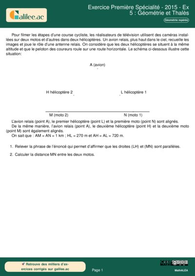 Cet exercice, bien qu'issu d'un sujet de brevet (DNB 2015), constitue une excellente base de révision pour les élèves de Première Spécialité souhaitant consolider leurs acquis en géométrie plane. L'énoncé place l'élève dans un contexte concret : la retransmission télévisée d'une course cycliste impliquant un avion, des hélicoptères et des motos. Le problème repose sur l'exploitation des propriétés de parallélisme et l'application d'un théorème fondamental du collège, souvent réutilisé dans les problèmes de géométrie spatiale ou de vecteurs en Première.