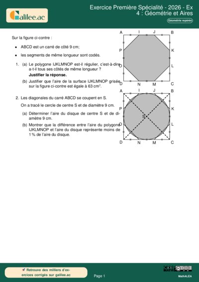 Cet exercice, extrait du sujet zéro pour le DNB 2026 mais adapté au niveau Première Spécialité pour l'étude des configurations géométriques, porte sur la comparaison d'aires entre un polygone (octogone) et un disque inscrit. L'enjeu est de mobiliser les connaissances sur le calcul de surfaces élémentaires, d'utiliser le théorème de Pythagore pour valider la nature d'un polygone et d'appliquer des calculs de proportions numériques (pourcentages).