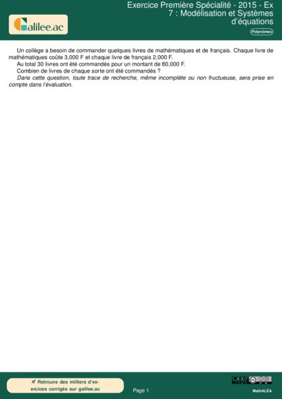 Soit x le nombre de livres de mathématiques et y le nombre de livres de français commandés. Nous pouvons traduire les données du problème par le système d'équations suivant :