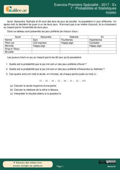 Exercice Première Spécialité - 2017 - Ex 7 : Probabilités et Statistiques