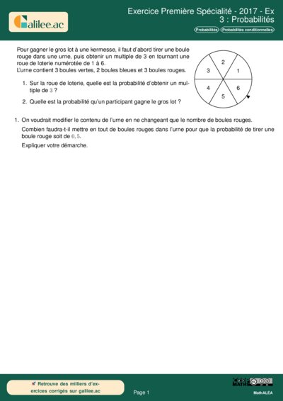 Cet exercice, bien qu'issu d'un sujet de 2017, constitue une base fondamentale pour les élèves de Première Spécialité Mathématiques abordant le chapitre des probabilités. Il met en jeu deux épreuves indépendantes : le tirage d'une boule dans une urne et la rotation d'une roue de loterie. La structure de l'exercice permet de mobiliser les principes de multiplication des probabilités pour des événements successifs et la résolution d'équations simples pour modéliser une situation aléatoire.