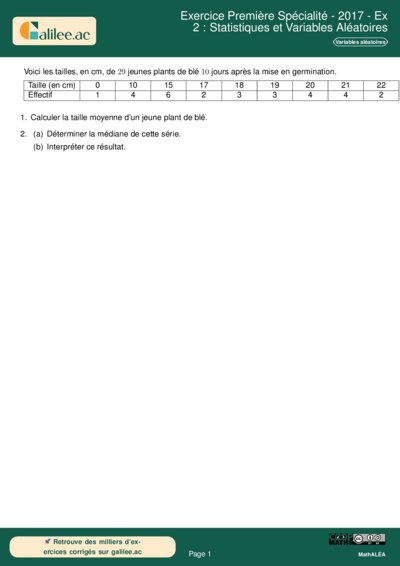 Ici, nous travaillons sur une série statistique quantitative discrète représentant la croissance de plants de blé. L'objectif est de synthétiser l'information contenue dans un tableau d'effectifs pour en extraire des valeurs caractéristiques : la moyenne (indicateur de centralité sensible aux valeurs extrêmes) et la médiane (indicateur de position séparant la série en deux groupes d'effectifs égaux).