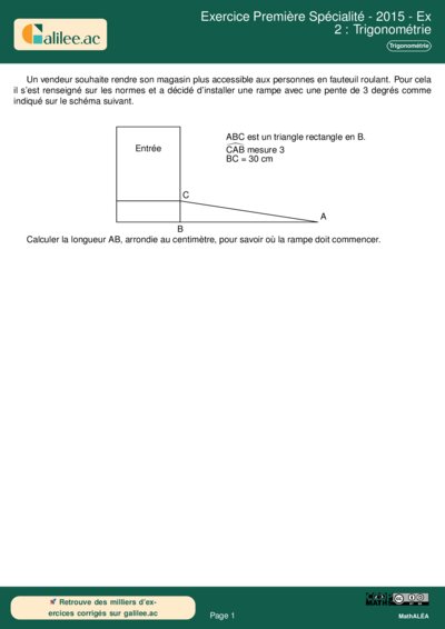 Cet exercice, issu du sujet de Nouvelle-Calédonie 2015, est une application concrète de la trigonométrie dans le triangle rectangle. Bien que positionné historiquement au niveau brevet, les notions de trigonométrie sont fondamentales en Première Spécialité, notamment pour l'étude du cercle trigonométrique et des fonctions sinus/cosinus. Ici, la problématique est de calculer une distance horizontale (AB) nécessaire pour installer une rampe d'accès respectant une pente de 3 degrés.