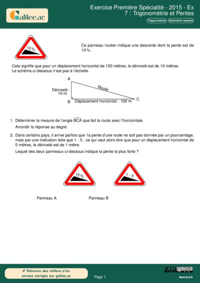Cet exercice, bien qu'issu d'un sujet de fin de collège, pose les bases fondamentales de la géométrie repérée et de la trigonométrie étudiées en Première Spécialité. Il traite de la notion de pente, concept qui sera plus tard modélisé par le coefficient directeur de la tangente en analyse (dérivation). L'énoncé demande de traduire une situation physique (un panneau routier) en un modèle géométrique (triangle rectangle) pour effectuer des calculs d'angles et des comparaisons de rapports numériques.