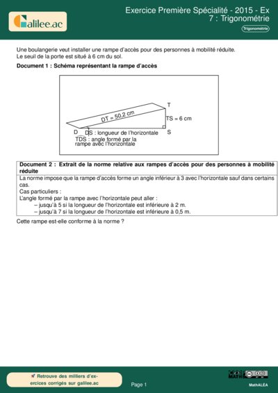 Cet exercice, bien qu'issu initialement d'un sujet de fin de collège, constitue un excellent support de révision pour le cycle terminal en Première Spécialité Mathématiques. Il mobilise des compétences fondamentales en géométrie plane et en trigonométrie dans un contexte de modélisation réelle : l'accessibilité des Personnes à Mobilité Réduite (PMR). L'objectif est de vérifier si une rampe d'accès respecte les normes de sécurité en calculant à la fois son inclinaison (angle) et sa longueur horizontale.