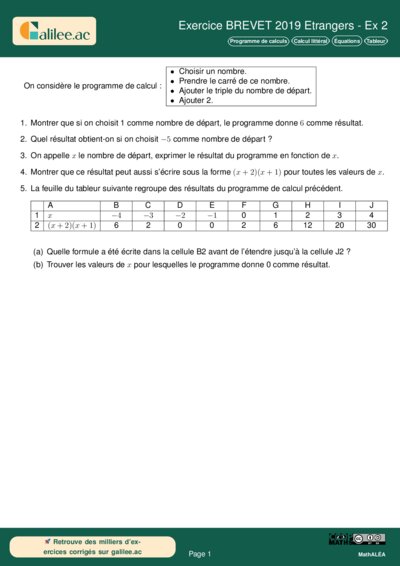 Chapitres: Programme de calculs Calcul littéral Équations Tableur