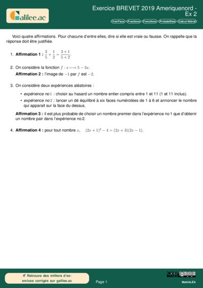 Chapitres: Vrai/Faux Fractions Fonctions Probabilités Calcul littéral