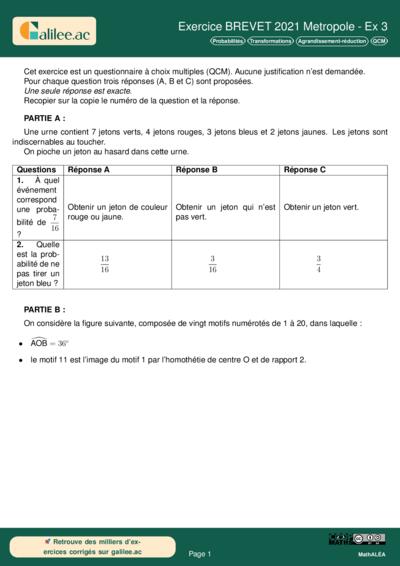 Chapitres: Probabilités Transformations Agrandissement-réduction QCM