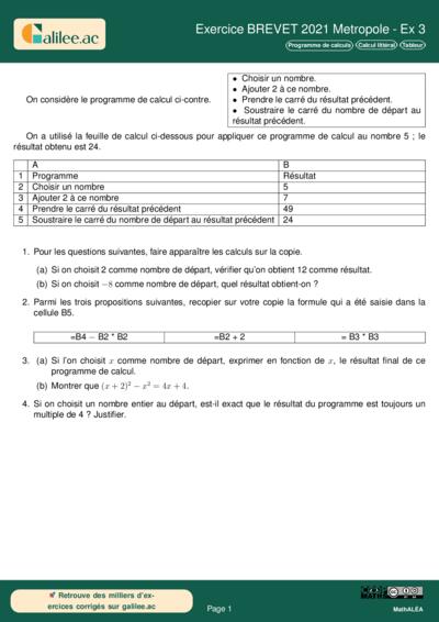 Chapitres: Programme de calculs Calcul littéral Tableur