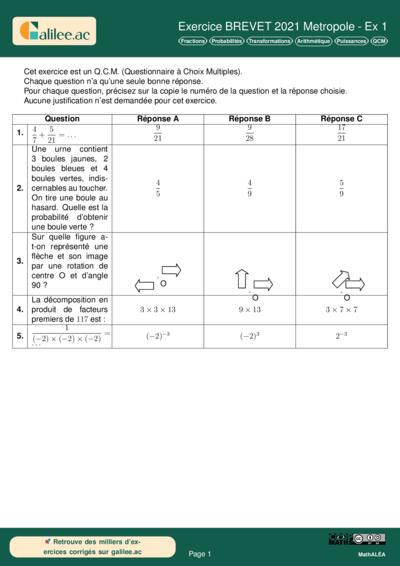 Chapitres: Fractions Probabilités Transformations Arithmétique Puissances QCM