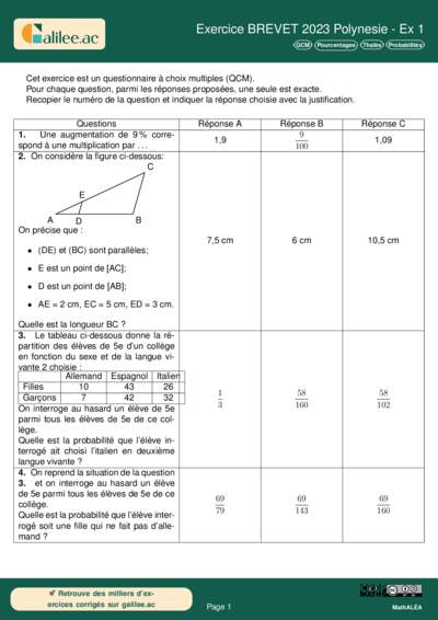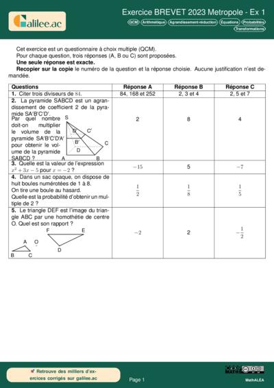 Chapitres: QCM Arithmétique Agrandissement-réduction Équations Probabilités Transformations
