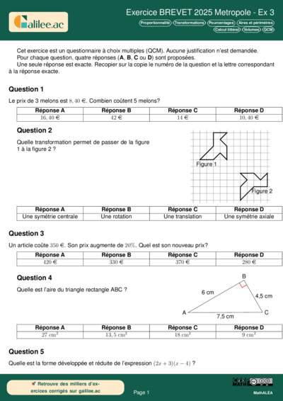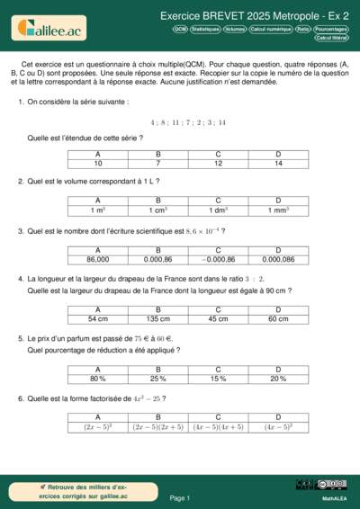 Chapitres: QCM Statistiques Volumes Calcul numérique Ratio Pourcentages Calcul littéral