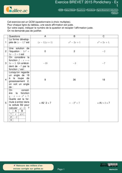 Chapitres: QCM Calcul littéral Équations Fonctions Agrandissement-réduction Tableur