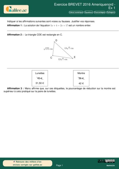 Chapitres: Calcul numérique Équations Pourcentages Pythagore