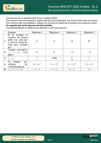Chapitres: QCM Agrandissement-réduction Calcul littéral Puissances Fractions