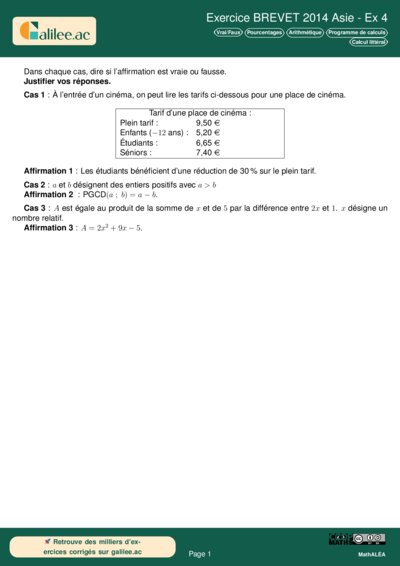 Chapitres: Vrai/Faux Pourcentages Arithmétique Programme de calculs Calcul littéral