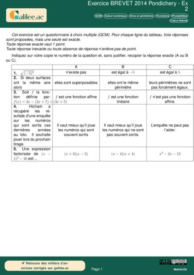 Chapitres: QCM Calcul numérique Aires et périmètres Fonctions Probabilités Calcul littéral