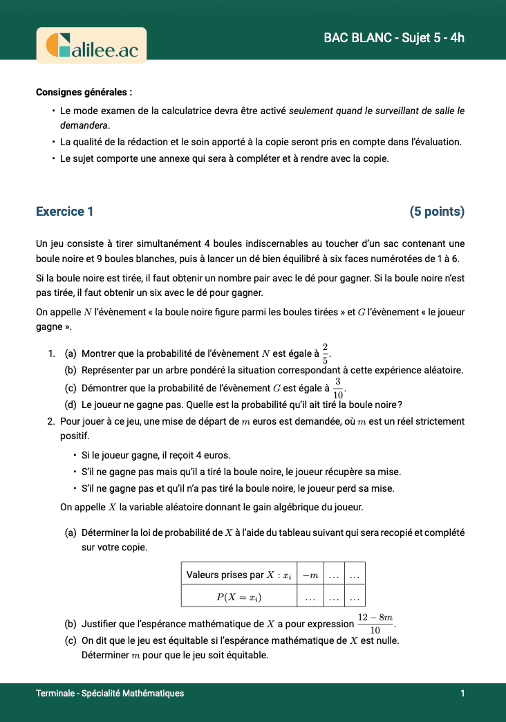 Un bac blanc équilibré et exigeant : probabilités, géométrie dans l’espace, analyse avec ln, et suites — le combo parfait pour te préparer au vrai jour J. 🚀