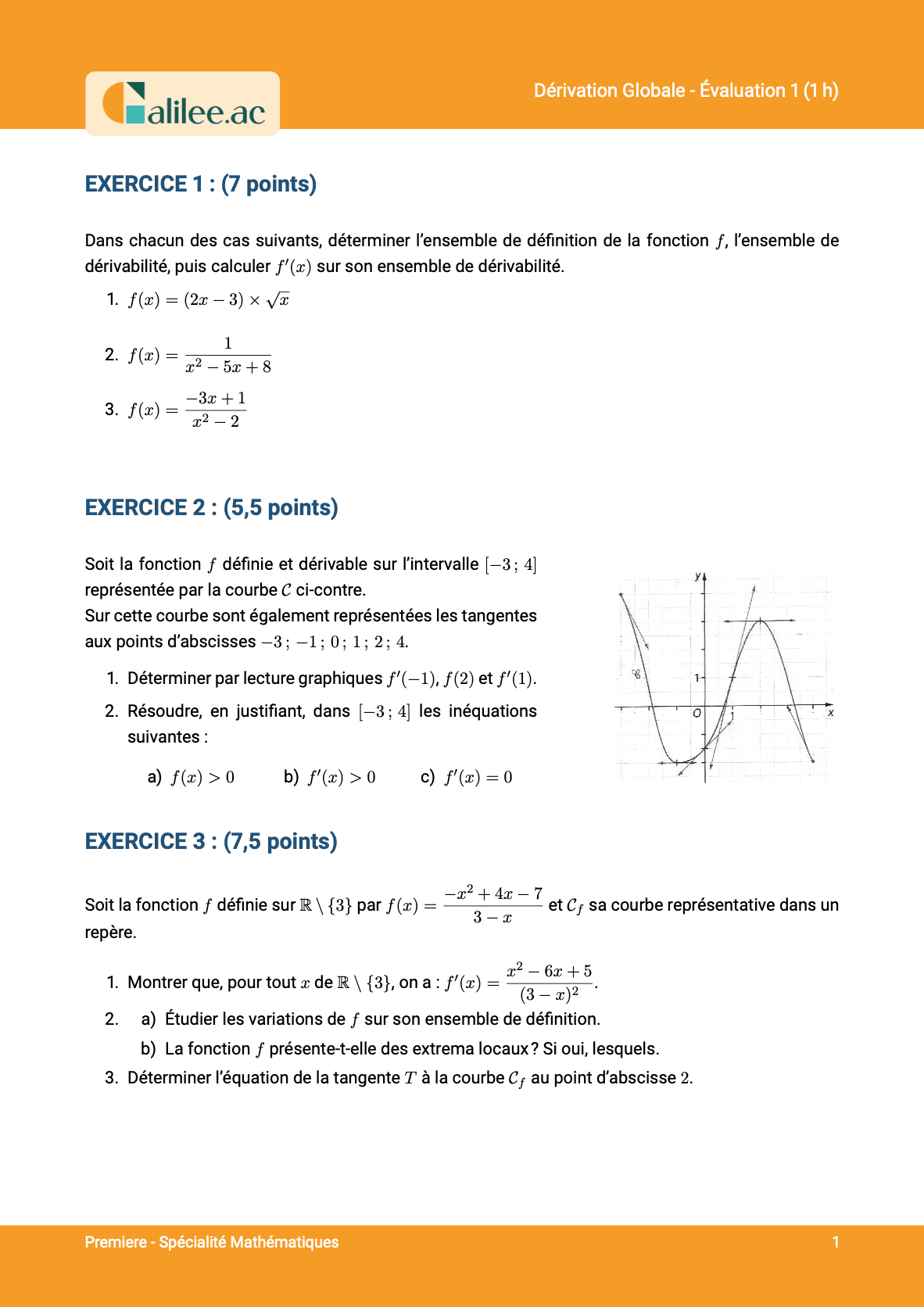 Contrôle Corrigé de Maths Première sur la Dérivation et l'Étude de Fonctions