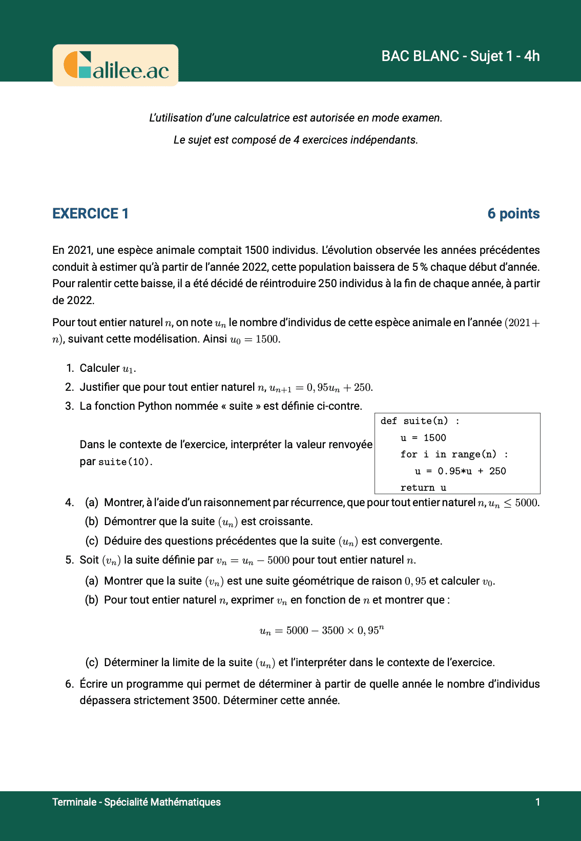 - 🐾 Suites : modélisation (baisse + réintroduction), récurrence, convergence, forme explicite & algo Python.