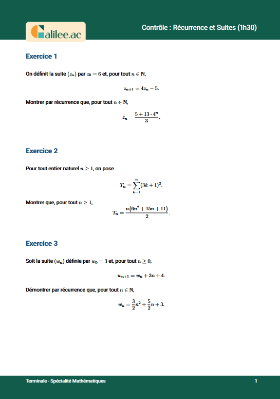 ⏱️ Durée : 1h30 • 5 exercices pour approfondir la récurrence et les suites numériques.