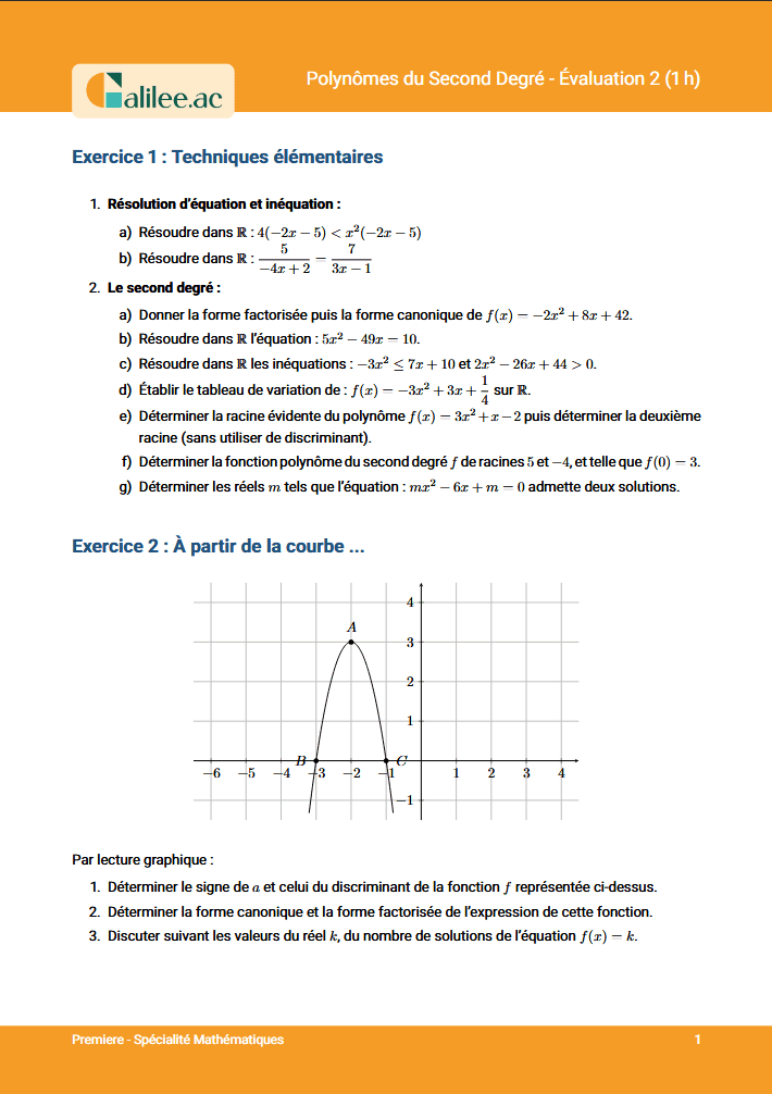 - 🧮 Exercice 1 : Résolutions pas à pas : inéquations, équations rationnelles, discriminant, formes canonique et factorisée, tableau de variations et conditions sur un paramètre.