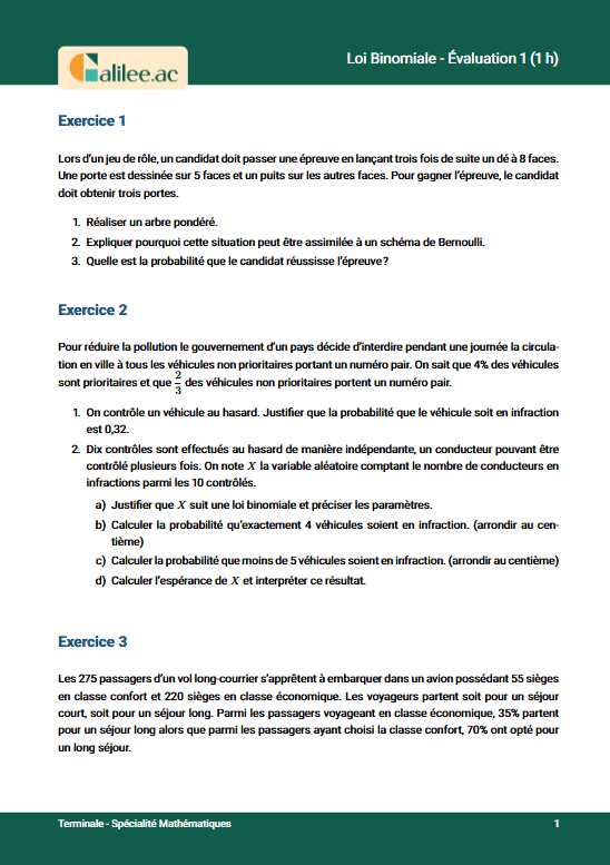 ⏱️ Durée : 1 h • Contrôle complet sur la loi binomiale et les probabilités.
