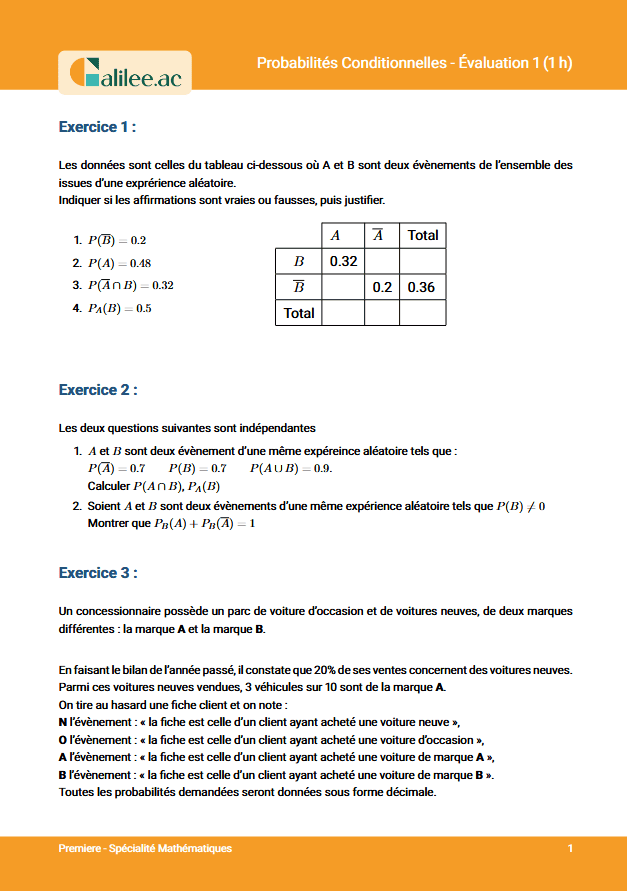 Prêt·e à booster tes compétences en probas ? Ce contrôle te plonge dans des situations concrètes et progressives : lecture de tableaux, arbres pondérés, calculs de P(A∩B), P(B|A), indépendance… tout y est pour devenir à l’aise et efficace. 🎯