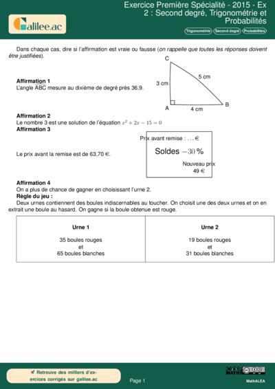 Exercice Première Spécialité - 2015 - Ex 2 : Second degré, Trigonométrie et Probabilités