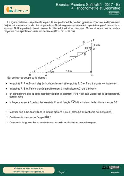 Cet exercice, bien qu'issu d'un sujet de série collège, constitue une excellente base de révision pour un élève de Première Spécialité. Il sollicite la capacité à modéliser une situation réelle (l'inclinaison d'une tribune de gymnase) par des outils géométriques. L'enjeu est de passer d'un schéma complexe à des configurations de triangles rectangles identifiables. Le problème repose sur l'utilisation des relations trigonométriques classiques et sur la propriété des droites parallèles (angles correspondants). En Première, cet exercice prépare à des notions plus complexes comme le produit scalaire ou l'étude des fonctions trigonométriques en exploitant la précision des calculs de longueurs.