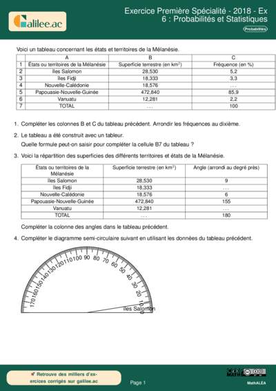 Cet exercice, bien qu'issu d'un sujet de 2018, mobilise des compétences fondamentales en statistiques descriptives et en gestion de données numériques, des notions qui servent de socle aux chapitres sur les Probabilités et les variables aléatoires en Première Spécialité. L'objectif est d'exploiter un tableau de données géographiques (la Mélanésie) pour calculer des sommes, des fréquences et des mesures d'angles afin de produire une représentation graphique semi-circulaire. L'exercice demande également de maîtriser l'outil tableur, un incontournable des mathématiques modernes.