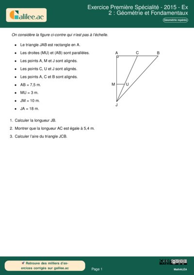 En Première Spécialité, ce type d'exercice pourrait être enrichi par l'utilisation d'un repère orthonormé. En posant A(0;0), B(7.5;0) et J(0;18), on pourrait retrouver les coordonnées de C et U par des équations de droites ou des calculs de vecteurs colinéaires, illustrant ainsi la puissance de la géométrie repérée sur la géométrie synthétique.