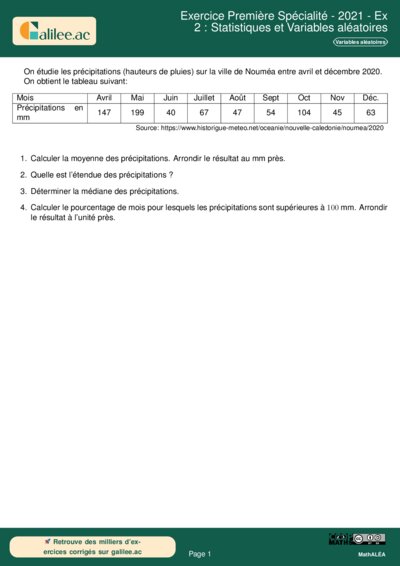 Cet exercice, extrait du sujet de Nouvelle-Calédonie de décembre 2021, s'appuie sur des données météorologiques réelles pour évaluer la maîtrise des statistiques descriptives. L'élève est confronté à une série de 9 valeurs représentant les précipitations mensuelles à Nouméa. L'objectif est d'extraire des indicateurs de position (moyenne, médiane) et de dispersion (étendue), tout en manipulant des fréquences sous forme de pourcentages. Pour un élève de Première Spécialité, cet exercice constitue une révision fondamentale car ces concepts sont le socle du chapitre sur les variables aléatoires, où la moyenne devient l'espérance mathématique et où la distribution des données préfigure la loi de probabilité.