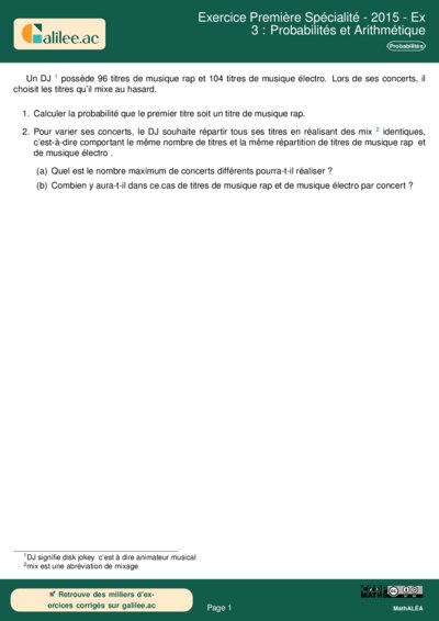 Exercice Première Spécialité - 2015 - Ex 3 : Probabilités et Arithmétique