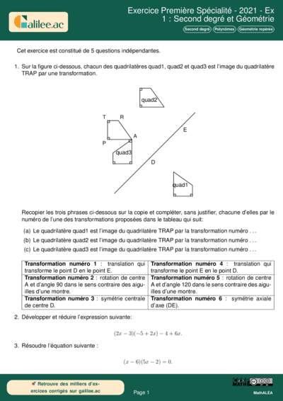 a. Le quadrilatère quad1 est l'image par la transformation numéro 6 (symétrie axiale d'axe DE) car la figure subit un effet miroir.