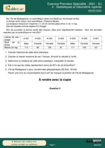 Cet exercice, bien qu'issu d'une base de type brevet, mobilise des compétences de traitement de données transversales essentielles au niveau Lycée. L'énoncé présente une série statistique quantitative (les masses des tortues) et qualitative (le sexe). Il demande d'exploiter ces données à travers des indicateurs de position et de dispersion, ainsi qu'une application pratique de repérage spatial sur une carte.
