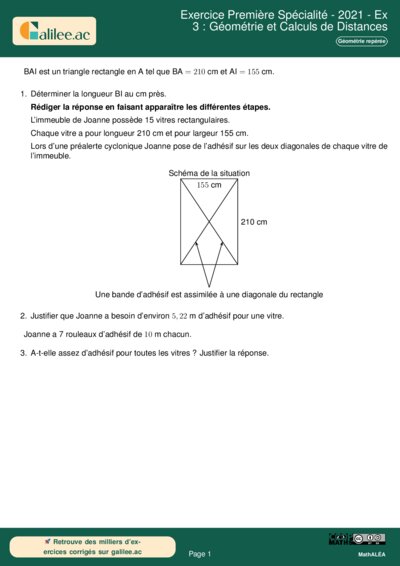 Cet exercice, issu du sujet de Nouvelle-Calédonie 2021, propose une application concrète de la géométrie plane dans un contexte de vie courante (sécurisation de vitres face à un cyclone). Bien qu'il s'agisse initialement d'un niveau fin de collège, son analyse est fondamentale pour un élève de Première Spécialité Mathématiques. En effet, le chapitre de Géométrie repérée repose entièrement sur l'extension du théorème de Pythagore à un repère orthonormé pour calculer la norme d'un vecteur ou la distance entre deux points.