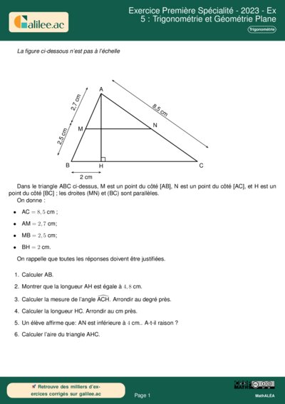 Cet exercice, bien qu'issu d'un sujet de fin de cycle 4 (DNB 2023), constitue une excellente base de révision pour un élève de Première Spécialité Mathématiques. Il permet de valider la maîtrise des configurations géométriques fondamentales qui seront réinvesties dans les chapitres sur le produit scalaire et la trigonométrie circulaire. L'exercice combine trois piliers de la géométrie plane : le théorème de Thalès, le théorème de Pythagore et les relations trigonométriques dans le triangle rectangle.
