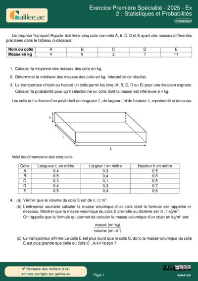 3. Probabilités : L'univers comporte 5 issues possibles. Les colis dont la masse est strictement inférieure à 8 kg sont A (4kg), B (non), C (2kg), D (7kg), E (non). Il y a 3 colis favorables sur 5. La probabilité est $P = 3/5 = 0,6$.